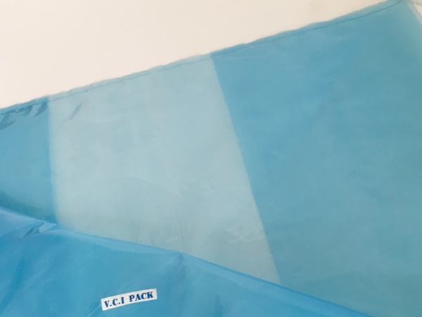 VCI氣相防銹膜(防銹袋)是將高分子聚乙烯樹脂(LDPE)與功能VCI樹脂配比混合,采用現(xiàn)代薄膜共擠技術(shù)生產(chǎn)的新一代復(fù)合防銹薄膜。具有良好的氣化防銹性能、阻隔防潮、使用方便、透明直觀等特點;當用塑料袋包裹金屬產(chǎn)品時,氣相緩蝕劑在封閉空間內(nèi)氣化并凝聚在所有金屬表面上形成氣相保護層,從而防止金屬產(chǎn)品銹蝕。符合GB-T19532-2004防銹性能要求。